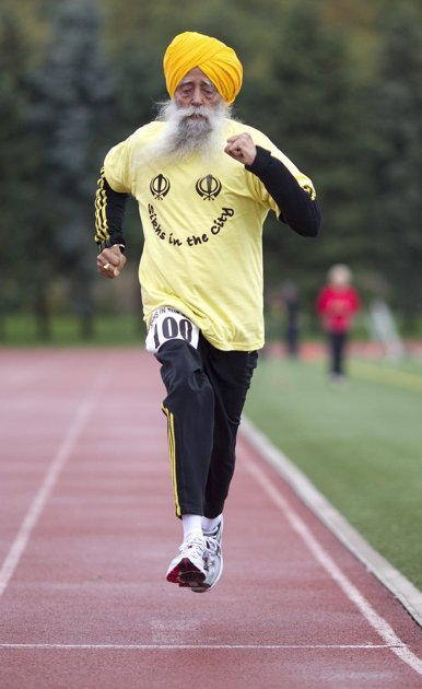 Centenarian Fauja Singh crosses the finish line in a 100 meter race for centenarians in Toronto, Thursday Oct. 13, 2011. One-hundred-year-old Singh, originally from India now living in London, England, is competing in Toronto’s Waterfront Marathon on Sunday.